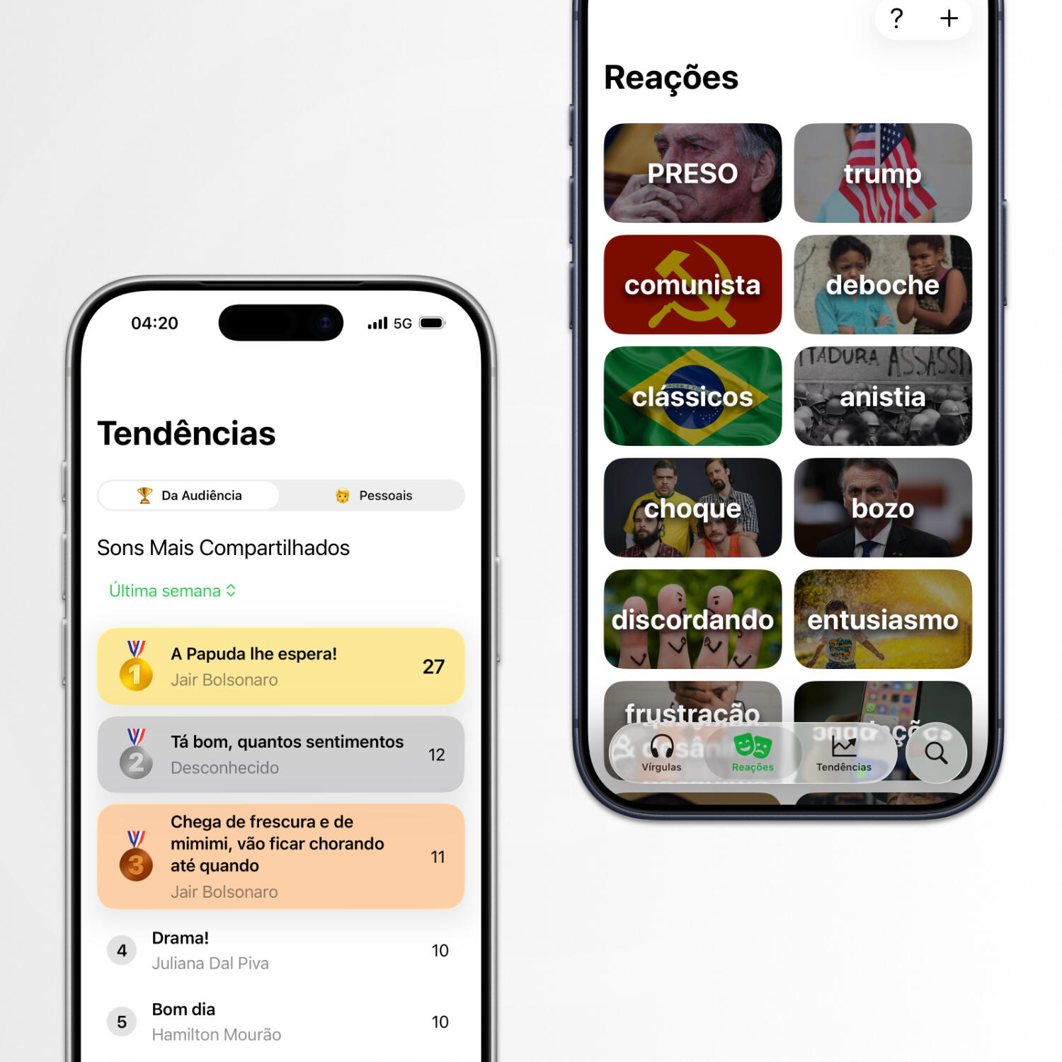 Confira os áudios mais compartilhados nas últimas 24 horas, semana ou mês. Ou navegue por reações — deboche, discordando, clássicos — e mande a resposta certeira pra qualquer situação.