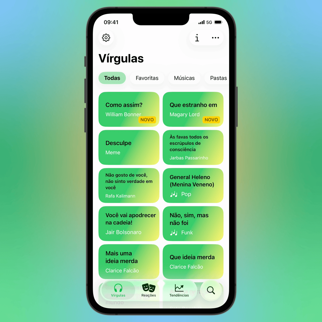 Confira os áudios mais compartilhados nas últimas 24 horas, semana ou mês. Ou navegue por reações — deboche, discordando, clássicos — e mande a resposta certeira pra qualquer situação.